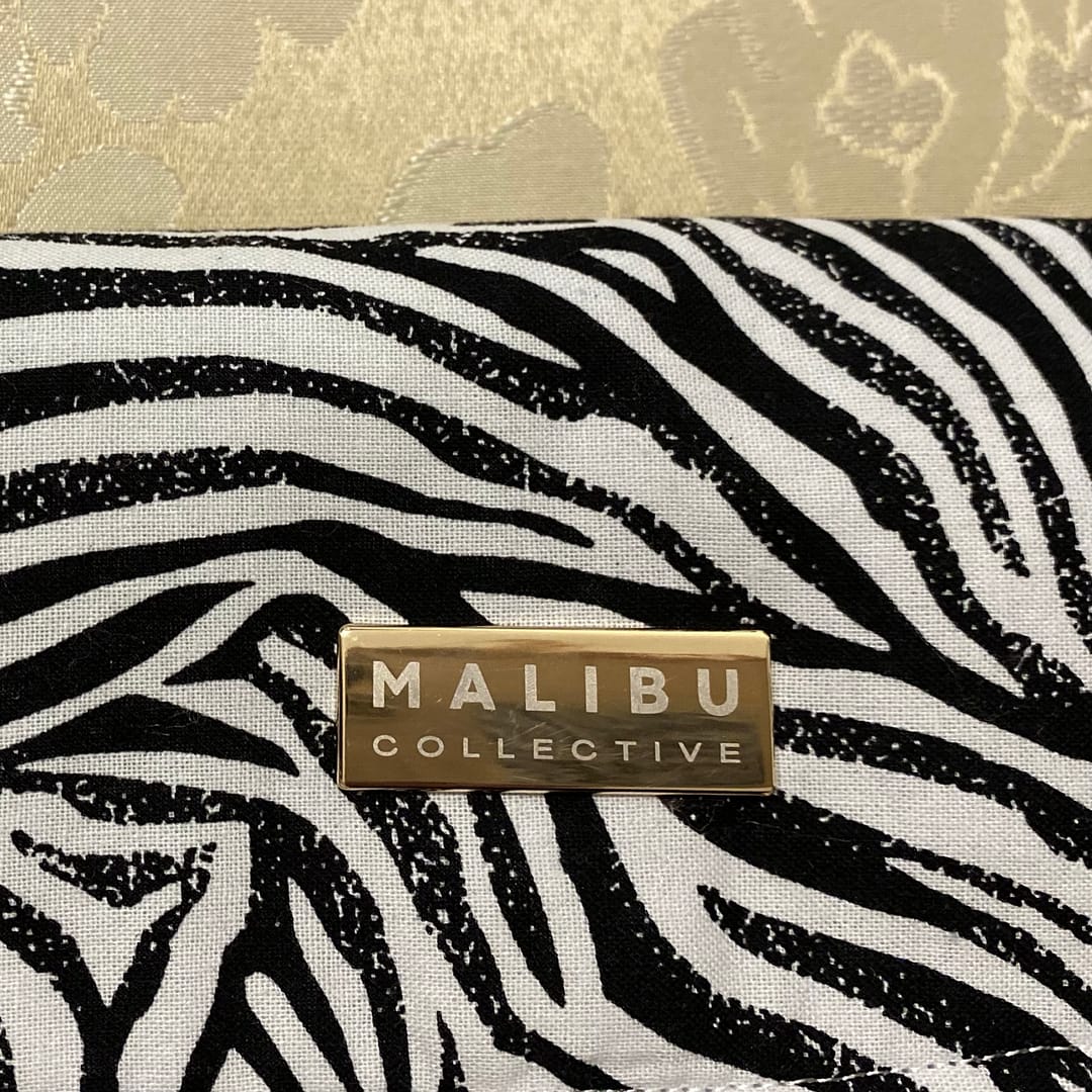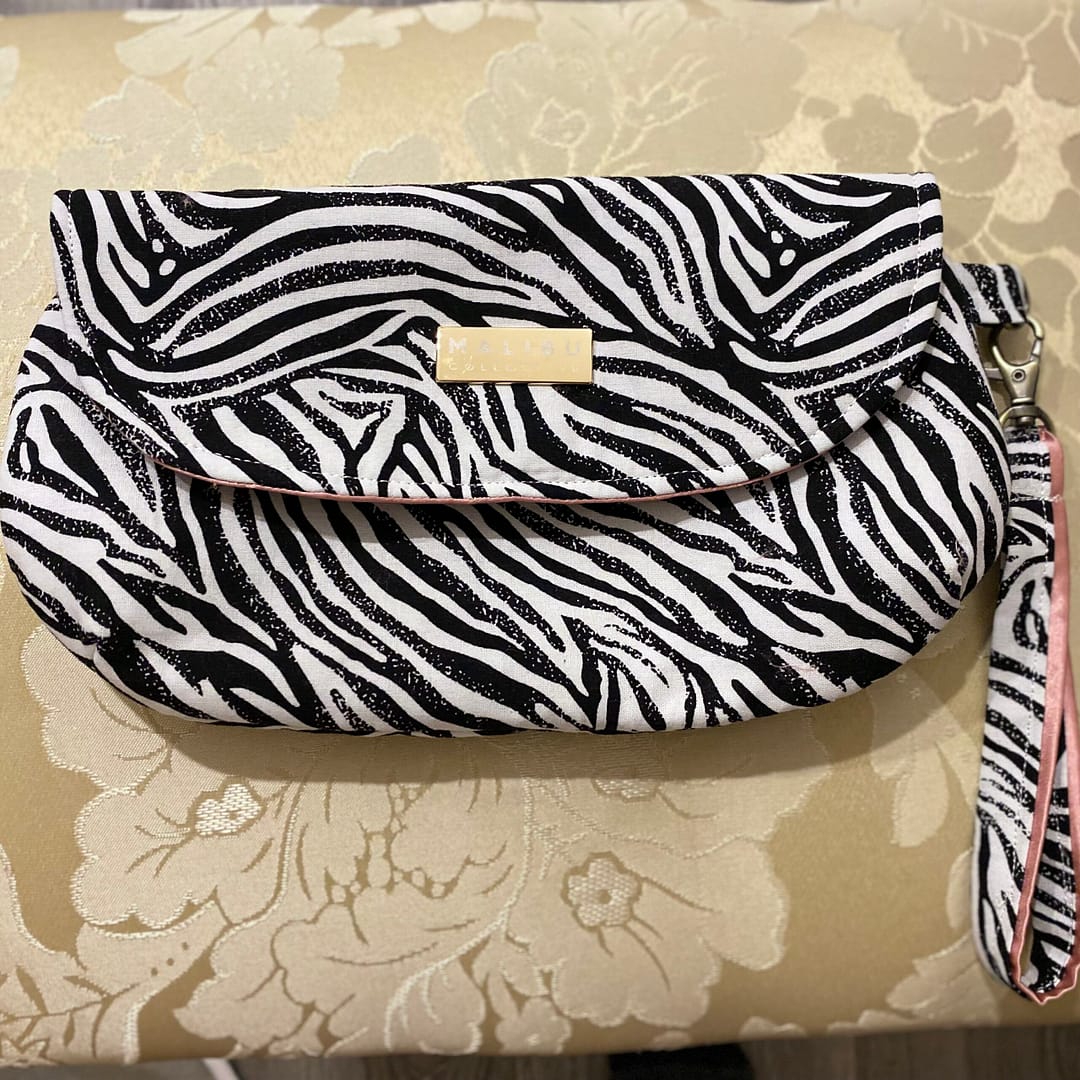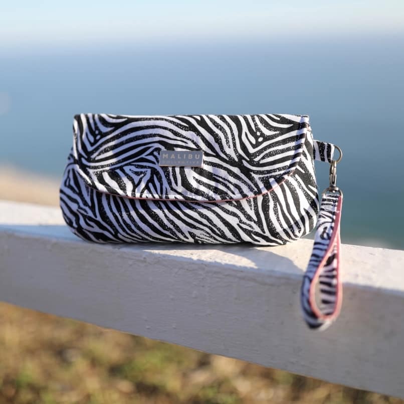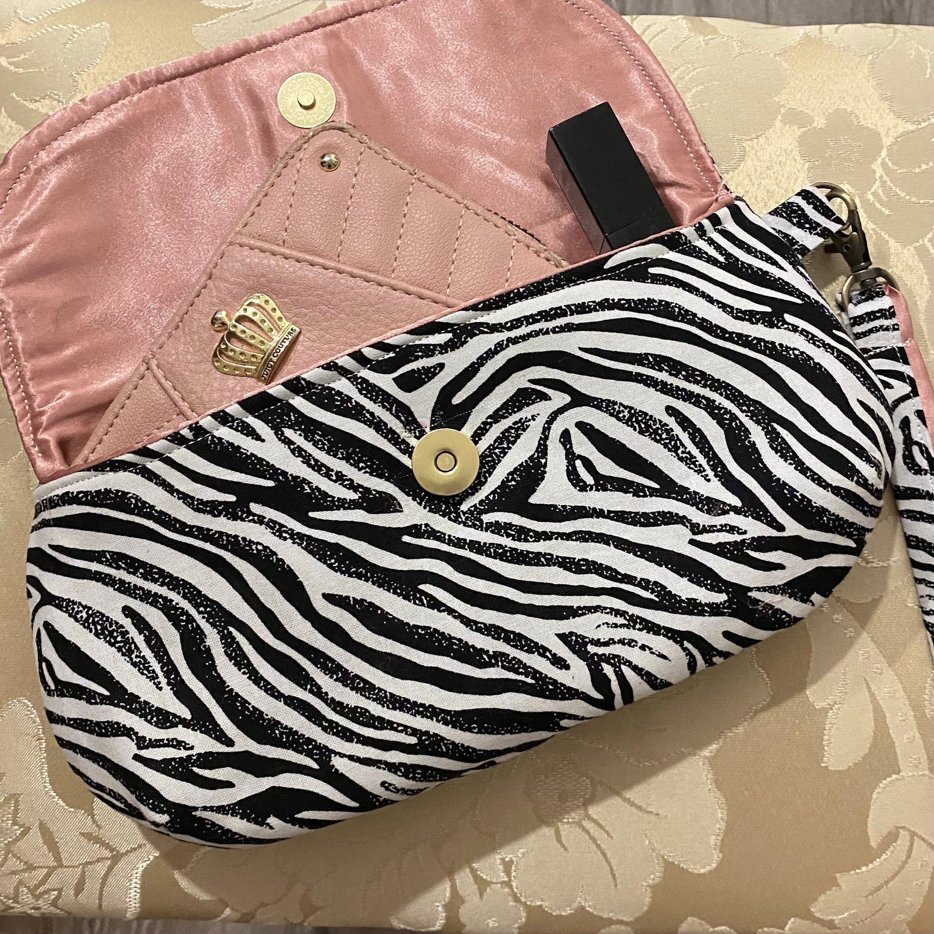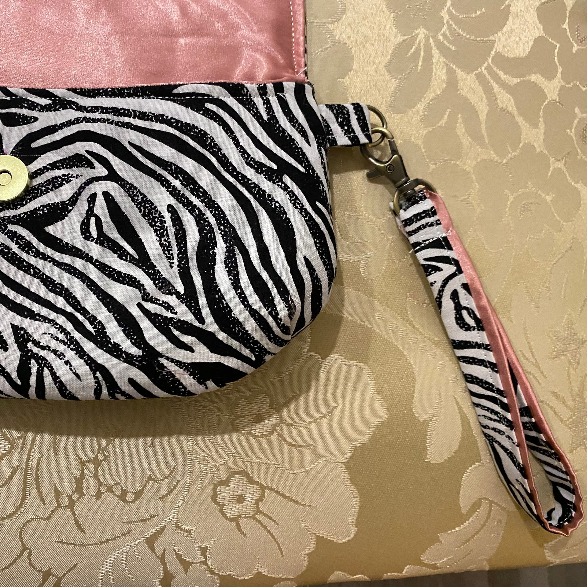 Handmade in Santa Monica, California, this fun yet classy clutch has a cotton zebra pattern outer on front and back, and a pink polyester satin lining. Hand strap has a pink satin accent.